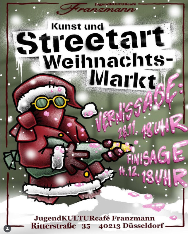 Liebe Freund*innen des (fast) guten Geschmacks … was letztes Jahr schon der absolute dascrazyhammer war, bietet sich Euch ab dem 28.11.25 wieder als ein Ereignis des fröhlichen Beisammenseins und dem Frönen exaltierter Sammelleidenschaft in Düsseldorf an: In den ehrwürdigen Hallen des wunderbaren jugendkulturcafe_franzmann habt Ihr ab dem 28.11.2025 die Gelegenheit, kleine Straßenwerke von delikaten Künstler*innen zu betrachten. Damit Ihr im Weihnachtsendspurt nicht verzweifelt, gibt es ein weiteres Mal einen liebevollen Kunst- und Streetart-Weihnachtsmarkt. Beschenkt Eure Lieben mit authentischer Urbanart zum fairen Preis!